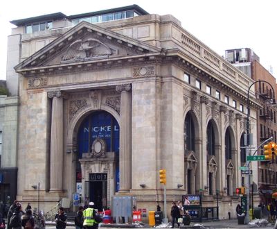 The New York County National Bank Building features a marble facade with classical elements at the corner of Eighth Avenue and West 14th Street.