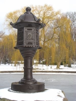 The Japanese Lantern stands on the western shore of the lagoon in Boston Public Garden, mounted on a granite boulder base from Rockport, Massachusetts.