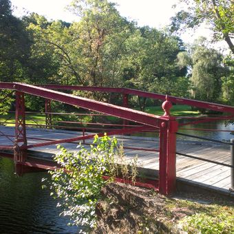 The Red Bridge spans 82 feet across the Quinnipiac River with a wooden deck and wrought iron lenticular pony truss structure resting on brownstone supports.