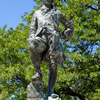 The bronze sculpture stands prominently in Lincoln Park, depicting the French explorer Robert Cavelier de LaSalle with a sword and pistol in his hands.