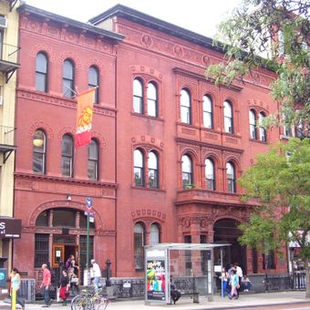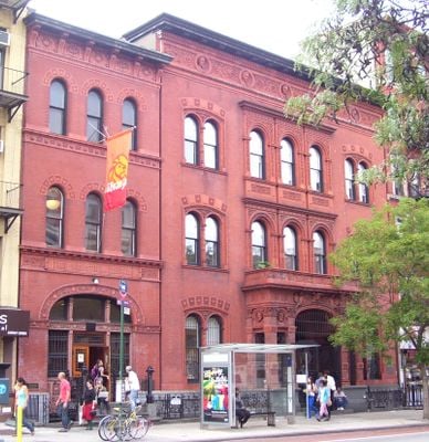 The building, designated as a New York City Landmark, currently functions as a branch of the New York Public Library alongside women's workspace facilities.