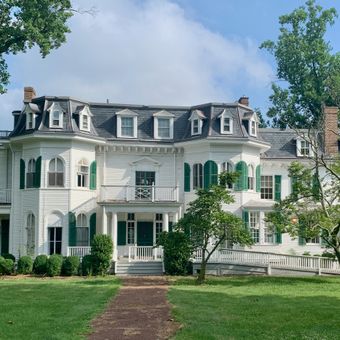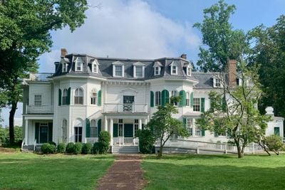 Wood Lawn features a Neoclassical design with clapboard siding, a mansard roof containing dormers, and two main floors above a basement level.