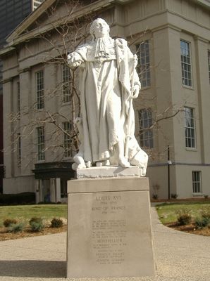 The marble statue of Louis XVI stands 10 feet tall on a limestone base, depicting the French king in ceremonial robes with an angel at his feet.