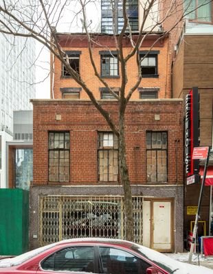 This brick house at 227 Duffield Street stands as a preserved structure within the modern urban landscape of Downtown Brooklyn's business district.