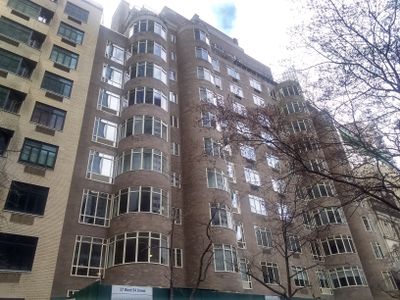 The Rockefeller Apartments consist of two eleven-story towers facing each other on West 54th and 55th Streets, featuring cylindrical bays protruding from the main structure.