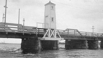 The square wooden lighthouse stood on a mounted foundation of the bridge connecting New Bedford to Fairhaven at the north end of New Bedford Harbor.