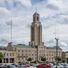 The limestone and brick structure features a central entrance block with a 209-foot tower and two flanking wings for municipal departments.