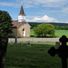 The stone church features limestone walls, lancet arched windows, a rose window above the entrance, and an octagonal steeple atop the belfry.
