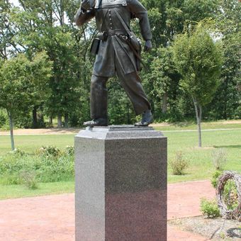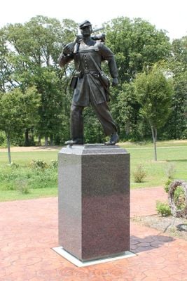The bronze and granite monument presents a life-size sculpture of a United States Colored Troops soldier carrying a rifle over his shoulder.