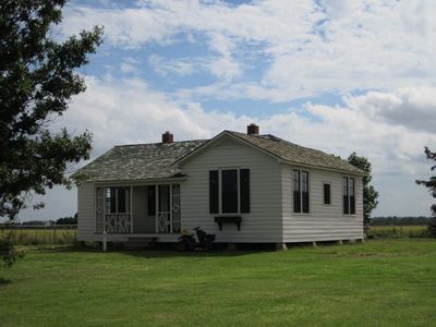 The five-room farmhouse at 110 Center Drive features white wooden siding, original furnishings, and cotton fields that extend across the surrounding landscape.