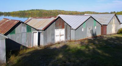The Stuntz Bay waterfront contains 143 boathouses arranged in a continuous row along the shoreline of Lake Vermilion in Minnesota.