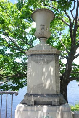 The Edwin Upton Curtis Memorial consists of two large decorative urns positioned along the Charles River, complementing the waterfront surroundings.