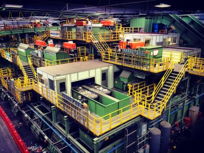 The facility spans 140,000 square feet of waterfront space, featuring processing buildings, storage areas, and advanced sorting technologies for metal, glass, and plastic materials.