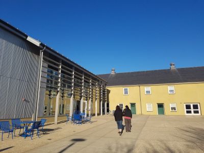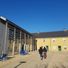 The stone barn maintains its original agricultural architectural elements while functioning as a modern venue for exhibitions, meetings, and outdoor events.