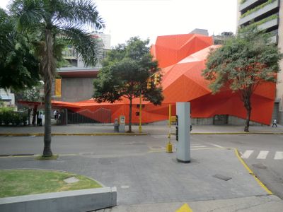 The Teatro Municipal de Chacao features an orange aluminum exterior with an irregular geometric shape covering a total area of 3000 square meters.