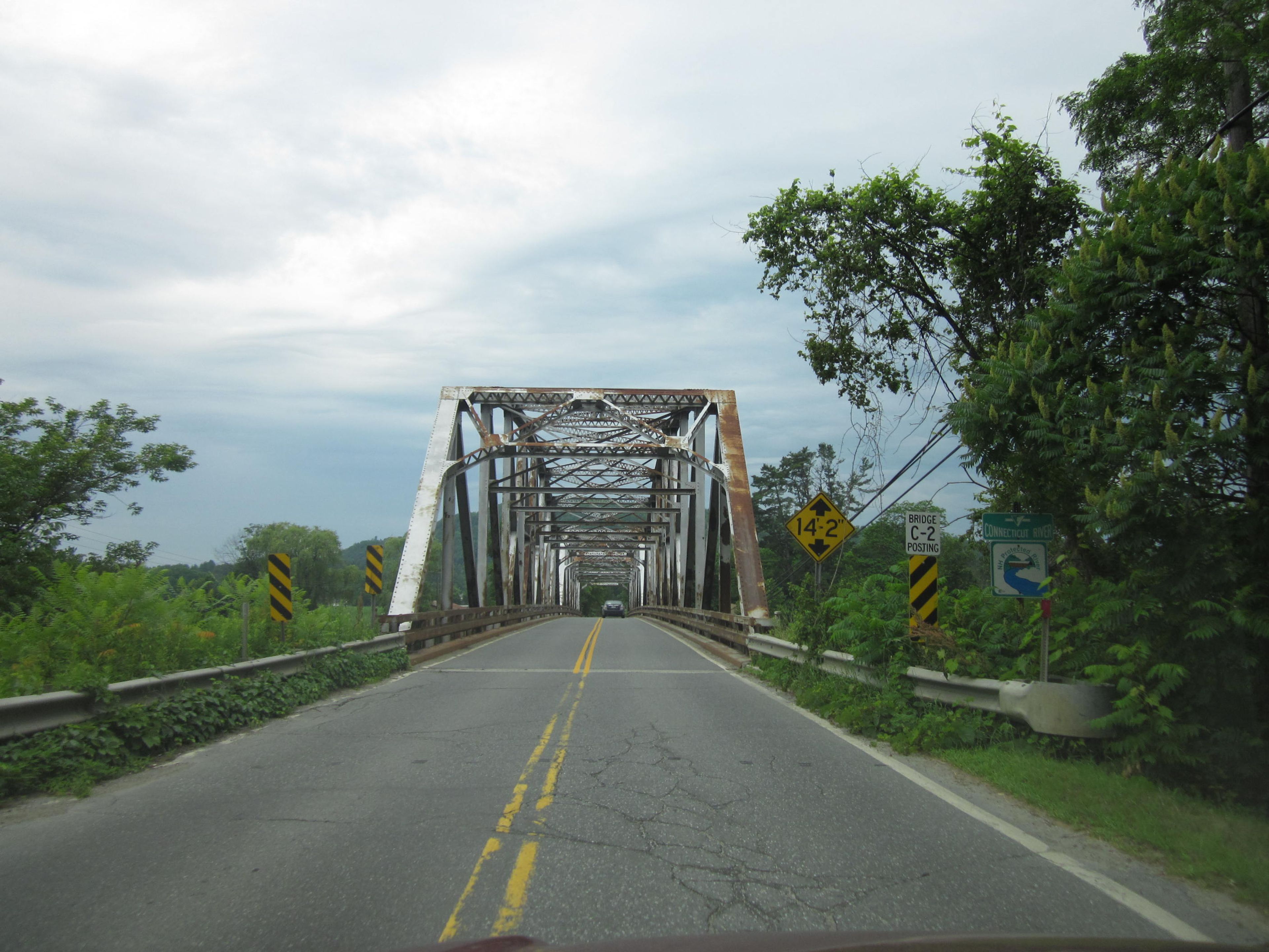 The Lyme-East Thetford Bridge stretches 471 feet over the Connecticut River with its steel Parker truss design supported by concrete abutments and a central pier.