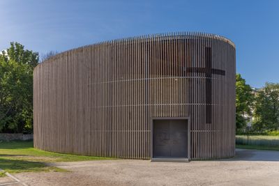 The Chapel of Reconciliation features an oval structure with wooden columns surrounding an inner sanctuary constructed from pressed clay and recycled materials.