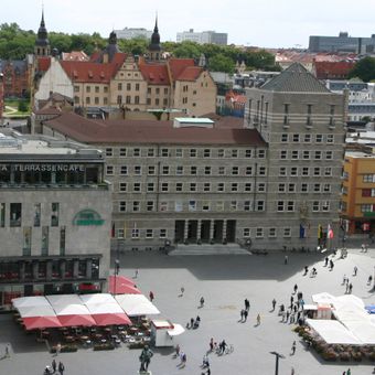 The Ratshof stands at the marketplace of Halle, featuring a massive corner tower and tall windows across its five administrative floors.