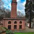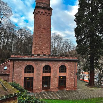 The stone ventilation building features a tower design with a square base and rises above the forest near Johannes-Hoops-Way in Heidelberg.