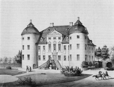 The castle maintains original baroque features from the 1850s, documented in the Album der Rittergüter und Schlösser im Königreiche Sachsen publication.