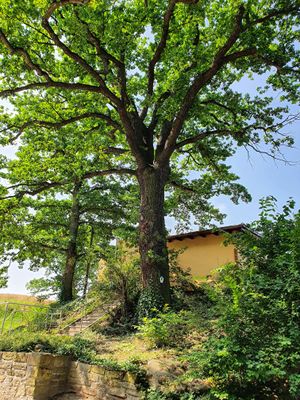 Quercus robur at the southern exit of the village Golben, natural monument in Gutenborn Municipality, Saxony-Anhalt, Germany