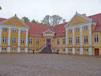 The manor displays traditional Danish architectural elements, including decorative wall columns and symmetrical wing construction characteristic of noble residences.