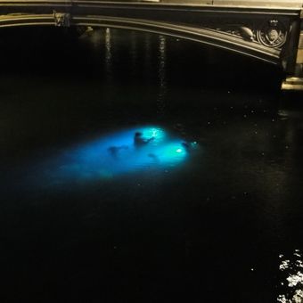 You can best observe the submerged figures from Højbro Bridge by looking over the railing. At dusk and with artificial lighting, the bronze figures become more visible and light reflects off the water.