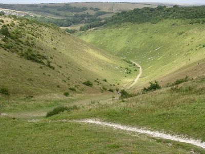 The valley extends for one mile through chalk hills, forming the deepest and widest dry valley formation in the United Kingdom.