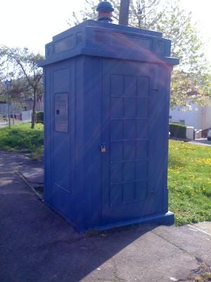 Local residents painted a multicolored scarf on the blue police box in the 1980s to reference the Fourth Doctor from the television series Doctor Who.