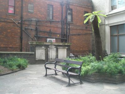 The site currently maintains a small garden space with railings, providing a historical marker within the commercial district of Cheapside.