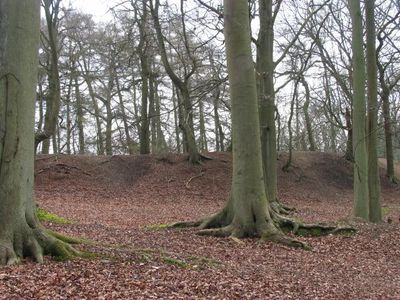 Grimsbury Castle is an Iron Age hillfort located on a plateau near Hermitage. The site consists of multiple earth ramparts and ditches that encircle the area and create significant elevation changes across the landscape.