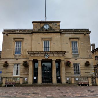 The Old Town Hall features a symmetrical frontage with three bays and a tetrastyle portico supported by four grand Doric columns and ashlar stonework.