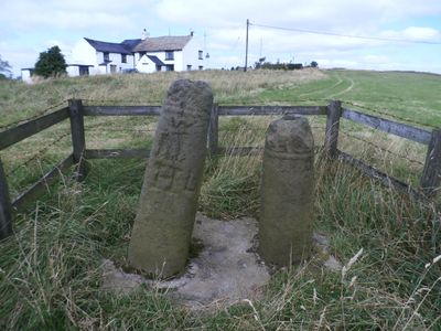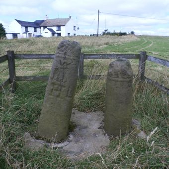 The Bow Stones consist of two cross shafts standing near an ancient ridgeway between Disley and Macclesfield, offering views over Lyme Park and surrounding regions.