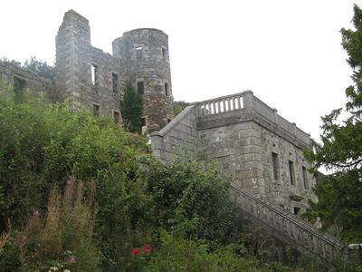 Ellon Castle is a stone country house in Aberdeenshire that sits on elevated ground overlooking the River Ythan and commands the landscape through its substantial size. The building features multiple windows and stands as a significant structure within the surrounding terrain.