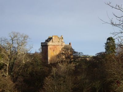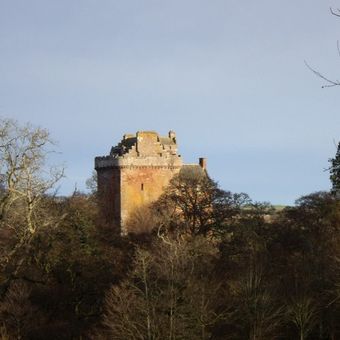 The rectangular stone tower stands four stories tall with thick walls and features an L-shaped layout near the River South Esk.