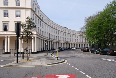 The curved architectural formation of Park Crescent spans in a semi-circular shape, featuring white stucco facades and ornate columns along its frontage.