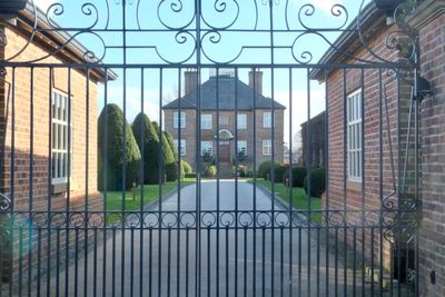 Bexton Hall stands as a square symmetrical building with five bays, constructed from plum-colored English garden wall bond brick and slate roofs.