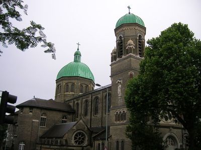 The Church of St Joseph features a substantial green copper dome visible across London and combines Romanesque and Byzantine architectural elements in its design.