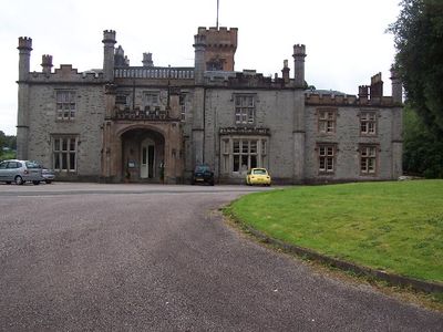 The two-storey country house stands near Holy Loch with a prominent higher tower that defines its architectural character in Argyll and Bute.