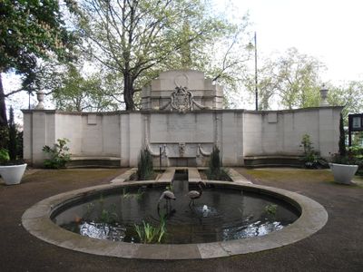 Cheylesmore Memorial is a limestone monument in Victoria Embankment Gardens featuring a decorative stone screen with integrated seating and a small water feature at its base. The structure sits openly within the gardens, creating a quiet stopping point among other monuments and green spaces.