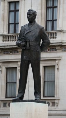 The statue portrays Admiral Mountbatten in full military uniform holding binoculars, standing at 2.7 meters tall on Mountbatten Green behind the Foreign Office.