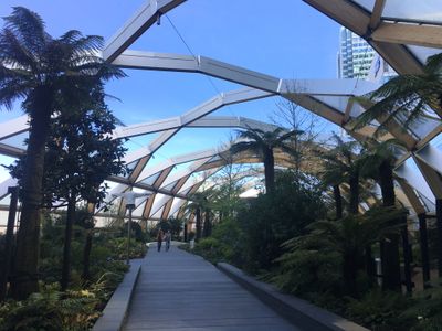 The garden, opened in 2015, reflects the maritime trading heritage of Canary Wharf through its design resembling a ship carrying plants from global expeditions.