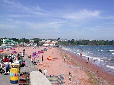 Goodrington Sands extends along the coast with red-golden sand and shallow waters divided into North Beach and South Beach sections.