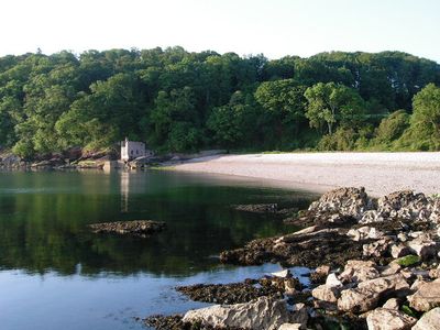 Elberry Cove features a shingle beach with clear waters, surrounded by wooded hillsides and accessible through the South West Coast Path.