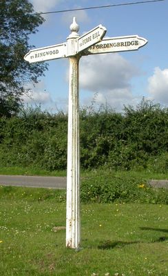 Signpost On Gorley Green, building in Ellingham, Harbridge and Ibsley, New Forest, Hampshire, UK