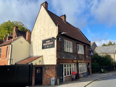 The Mischief Tavern occupies a brick and flint building with early sash windows, multiple drinking areas, and three pool tables near River Wensum.