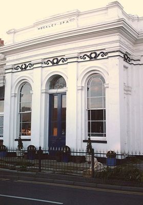 The Hockley Spa Rooms features a stucco facade, grey slate roof, and five bays with three central sections projecting forward from the main structure.