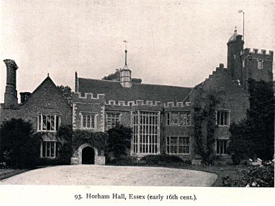 The Tudor-style Horham Hall combines brick construction with timber framing, featuring an oriel window and exposed ceiling beams in its south wing.
