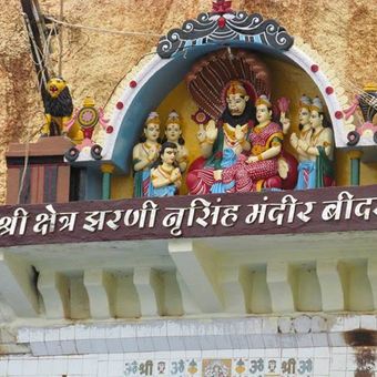 Narasimha Jharni is a cave temple in Bidar, in the state of Karnataka, India, reached through an underground passage roughly 300 meters long. Visitors wade through hip-deep water in the tunnel before arriving at deity carvings and natural formations embedded in the laterite rock wall.