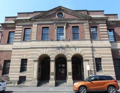 The Newcastle City Baths features a grand portico with Doric columns and five square windows arranged above the main entrance.